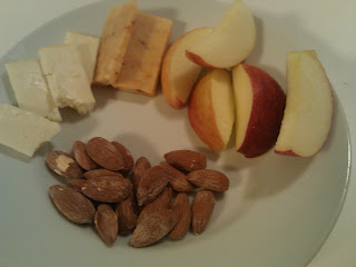Did you ever have one of those nights where your own for dinner and you don't feel like cooking or really doing nothing for that matter? John is at the Bruins game tonight and I don't feel like cooking so leftovers it is. I started with a smallish snack of apple slices, cheese and almonds.